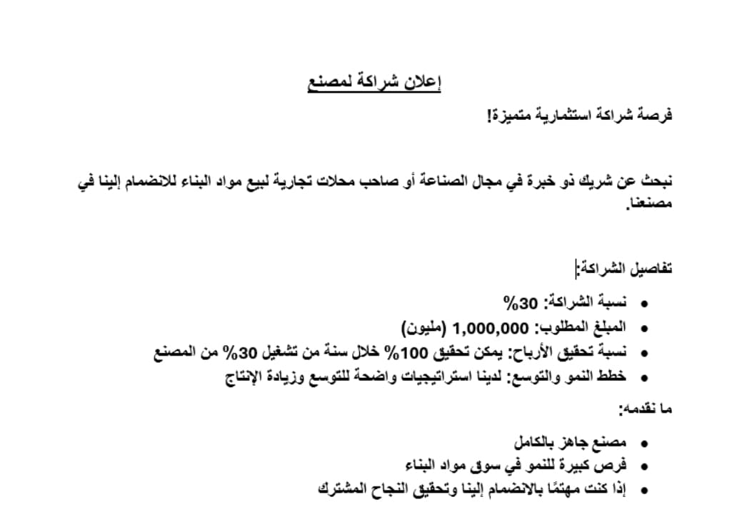 فرصة شراكة استثمارية متميزة! نبحث عن شريك ذو خبرة في مجال الصناعة أو صاحب محلات تجارية لبيع مواد البناء للانضمام إلينا في مصنعنا. تفاصيل الشراكة: • نسبة الشراكة: 30% • المبلغ المطلوب: 1,000,000 (مليون) • نسبة تحقيق الأرباح: يمكن تحقيق 100% خلال سنة من تشغيل 30% من المصنع • خطط النمو والتوسع: لدينا استراتيجيات واضحة للتوسع وزيادة الإنتاج ما نقدمه: • مصنع جاهز بالكامل • فرص كبيرة للنمو في سوق مواد البناء • إذا كنت مهتمًا بالانضمام إلينا وتحقيق النجاح المشترك يرجى التواصل عبر الهاتف نحن نتطلع إلى شراكة ناجحة ومثمرة!
