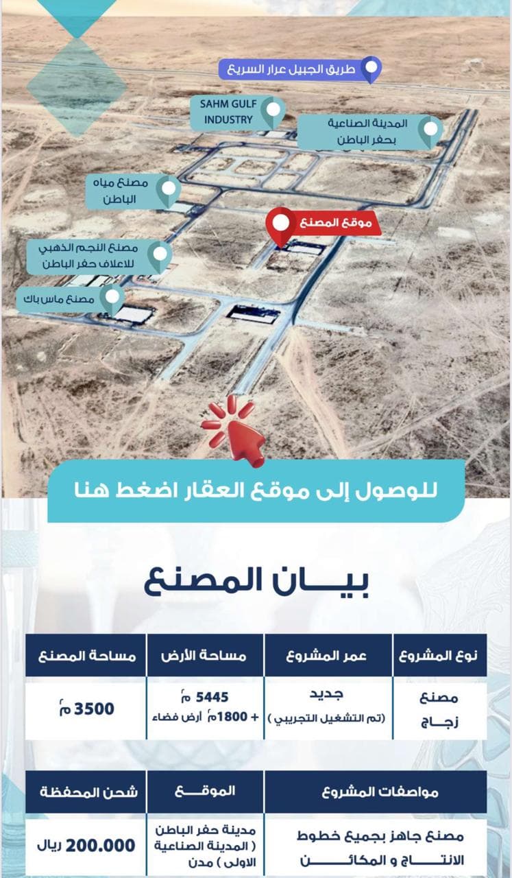 مصنع زجاج ( مدعوم من قبل صندوق التنمية الصناعي ) عمر المشروع: جديد ( تم التشغيل التجريبي ) مساحة الارض: 5445 متر مربع + 1800 متر مربع ارض فضاء المدينة: حفر الباطن ( المدينة الصناعية الاولى ) مدن مساحة المصنع:3500 متر مربع صفة الموقع : مصنع قائم بيع او شراكة حسب المستثمر فكرة المشروع: مصنع لانتاج زجاج الامان ( السيكوريت ) وانتاج الواجهات الزجاجية ( الاستركشر ) و الابواب الزجاجيه مواصفات المشروع: مصنع جاهز بجميع خطوط الانتاج و المكائن متوقف عند مر المنتجات: واجهات زجاج زجاج دبل زجا ج الاستركشر الابواب الزجاجيه الزجاج المصفح الزجاج الملون للديكورات