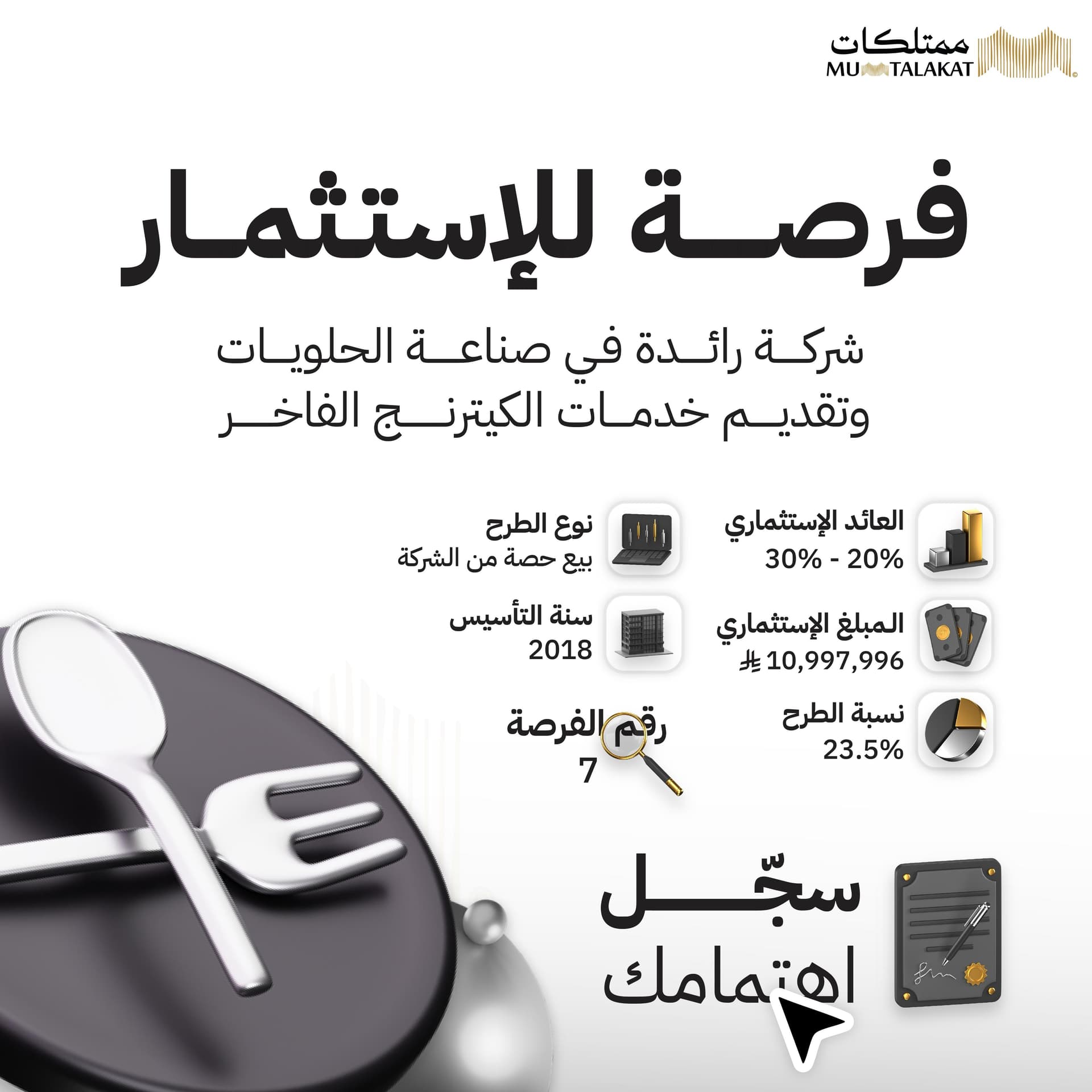شركة واعدة في قطاع الحلويات الفاخرة وخدمات الكيترنج الفاخر تفتح باب الاستثمار أمام الراغبين في الدخول إلى سوق مربح ومتنام. العائد الإستثماري: 20% - 30% نسبة الطرح: 23.5% المبلغ الإستثماري: 11000000 ريال سعودي