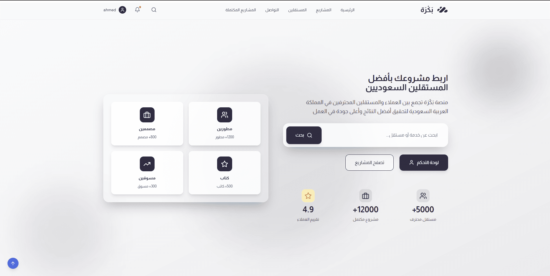 نقدم لكم منصة بَكْرَة هو مشروع في مراحله الأولى ويقدم حل لمشكلة عدم توافر منصة موثوقة تربط بين المستقل السعودي ومقدم الطلب نموذج العمل سهولة الاستخدام: نظام بسيط يتيح للمستخدمين إنشاء حساباتهم، نشر مشاريعهم، والتواصل مع المستقلين بكل سهولة. ضمان الجودة: جميع المستقلين نراجعهم بعناية لضمن تقديم خدمات عالية الجودة. الفرص الاستثمارية التوسع في السوق: نهدف لتوسيع قاعدة المستقلين والخدمات المقدمة، للزيادة من عدد المشاريع المكتملة وحجم الإيرادات. الشراكات الاستراتيجية: نبحث عن شراكات مع شركات تقنية ومؤسسات تعليمية لتعزيز مستوى الخدمات والتوسع في السوق. المطلوب هو فرصة إستثمارية لمن يرغب في الإستثمار في المجال التقني لدينا المهارات والخبرة ومشروعنا قائم لكن ينقصنا السيولة رابط المشروع : https://bakra-saudi.space/